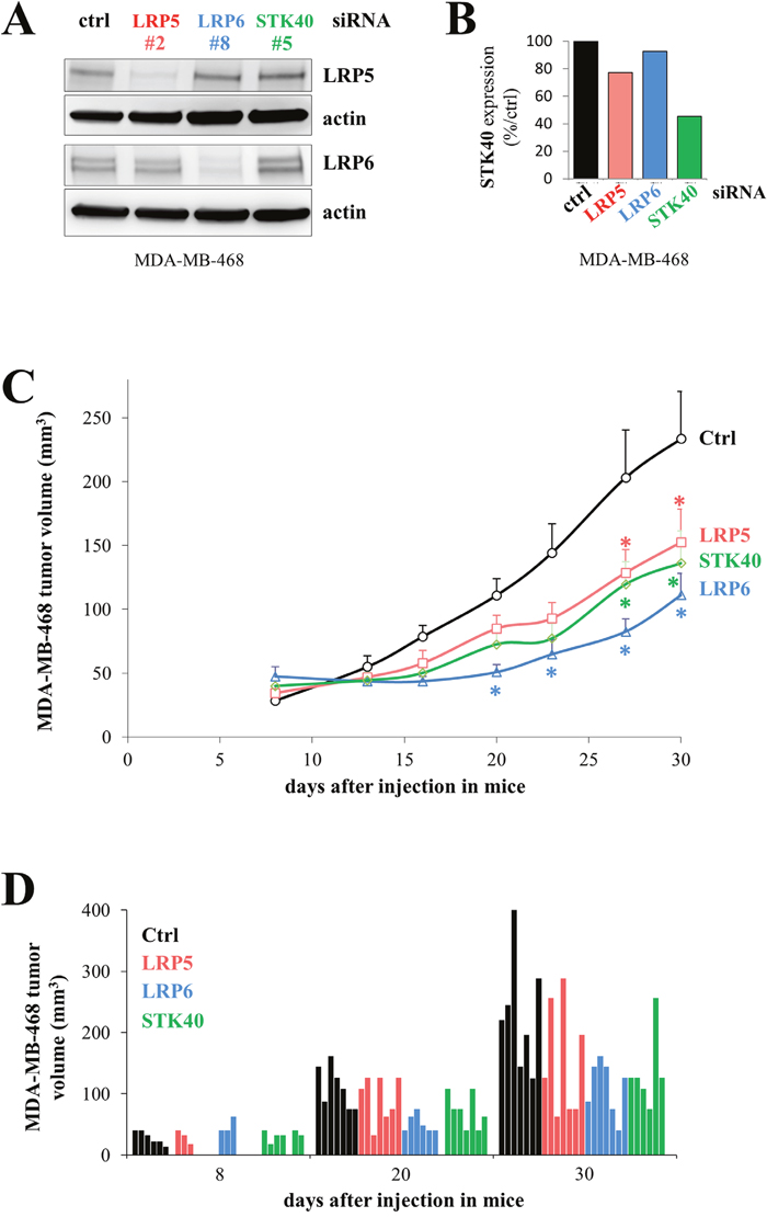 Figure 7: The depletion of LRP5, LRP6 or STK40 delays tumor growth. MDA-MB-468 cells were transfected with control (ctrl, black), LRP5 (#2, red), LRP6 (#8, blue) or STK40 (#5, green) siRNAs. (A) The levels of LRP5 or LRP6 protein were evaluated by western blotting 24 hours after transfection. Actin was used as a loading control. (B) STK40 RNA levels were assessed by RT-qPCR analysis 24 hours after transfection with siRNA (C) Twenty-four hours after transfection, 4×106 MDA-MB-468 cells were injected subcutaneously into Swiss nude mice (7 animals/group). Tumor growth was evaluated twice weekly for one month. The data shown are means + SD. The differences between the control siRNA and the other siRNAs (LRP5, LRP6 or STK40) were tested at each time point using an anova model on the raw data and on the square-rooted data, and adjusted for multiple testing using the Benjamini Hochberg correction (Supplementary Figure 1). Differences were considered significant if the adjusted P value was below 0.05 with both raw and squared-rooted data (indicated by *: LRP5 and STK40: days 27 and 30; LRP6: days 20, 23, 27, 30). (D) Tumor volume is indicated for each animal at three time points (8, 20 and 30 days) following the injection of the transfected cells.