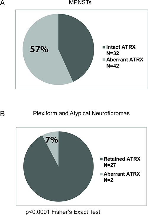 MPNSTs are aggressive sarcomas with limited treatment options and poor overall survival. Furthermore, there are few clinicopathological features that influence outcome and no accurate biologic markers to predict the clinical course or progression. As such, there is a pressing need to identify new therapeutic targets and biomarkers of disease biology. Given the recent literature suggesting a role for ATRX in the pathogenesis and prognostication for GBM [14] and other gliomas, [11, 15] including NF1-related gliomas [16], our recent publication demonstrating ATRX mutations in 2/7 MPNSTs sequenced [7], and the reported correlation between ATRX immunostaining and mutational status [15, 17, 18], we explored whether or not ATRX expression was altered in a large subset of MPNSTs.