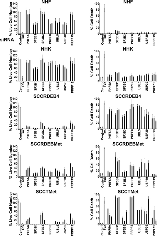 Figure 1: Splicing factor knockdown can selectively kill cSCC cells. Normal skin cells (NHF, NHK) and cSCC lines derived from a primary tumour (SCCRDEB4) and a metastatic tumour (SCCRDEBMet) from RDEB patients and a metastatic tumour from a transplant recipient (SCCTMet) were mock transfected (−), transfected with a non-targeting siRNA (Control) or transfected with three individual siRNAs targeting the indicated splicing factors. A cytotoxic siRNA (TOX) was used as a positive control for transfection efficiency. Cell viability (live cell number) expressed as a percentage of carrier alone and the percentage of dead cells were assayed by real-time imaging 96 hours after transfection. The values are the mean −/+ range of two independent experiments. Splicing factor knockdown generally caused a larger reduction in viability and a greater level of cell death in cSCC cell lines than in normal skin cells.