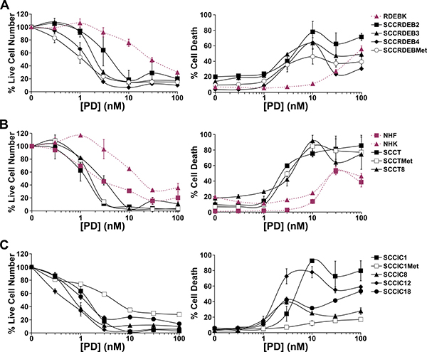 Figure 2: The small-molecule SF3B1 inhibitor pladienolide B selectively kills cSCC cell lines. Normal skin cells and cSCC cell lines were incubated with the indicated concentration of pladienolide B (PD) for 72 hours. Cell viability (live cell number) expressed as a percentage of carrier alone and the percentage of dead cells were assayed by real-time imaging. Values are the mean −/+ SEM of at least three independent experiments (NHF, RDEBK, SCCRDEB4, SCCRDEBMet, SCCIC8, SCCIC12, SCCIC18) or the mean −/+ range of two independent experiments (NHK, SCCRDEB2, SCCRDEB3, SCCT, SCCTMet, SCCT8, SCCIC1, SCCIC1Met). (A) Keratinocytes (RDEBK) and cSCC cell lines derived from RDEB patients (SCCRDEB). (B) NHF and NHK. cSCC cell lines derived from transplant patients (SCCT). (C) cSCC cell lines derived from immunocompetent patients (SCCIC) The majority of cSCC cell lines were killed at lower concentrations of pladienolide B than normal skin cells.