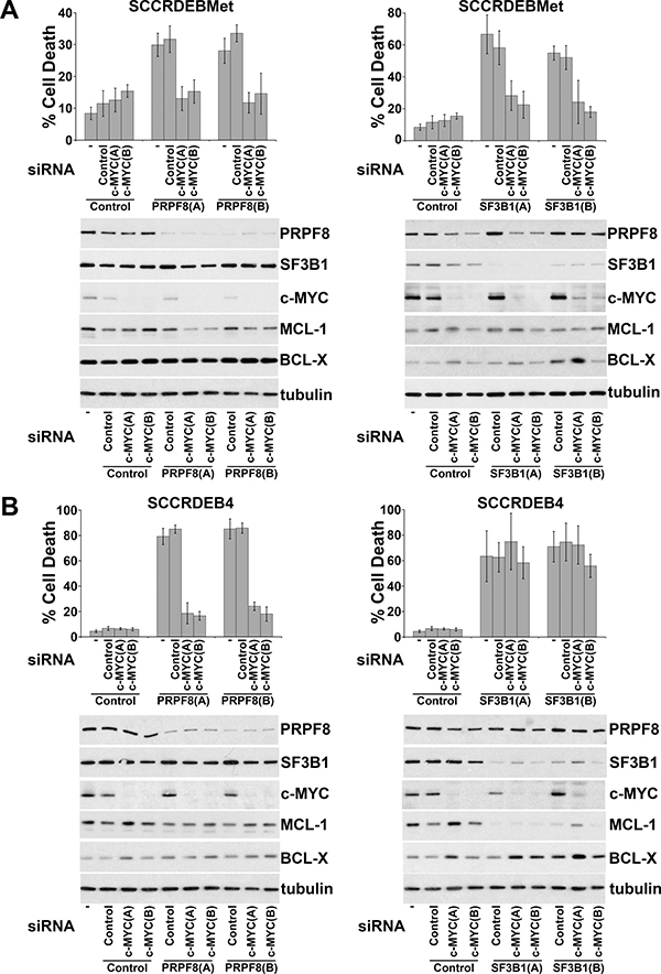 Figure 3: Endogenous c-MYC can confer sensitivity to PRPF8 and SF3B1 knockdown in cSCC cells. Cells were mock transfected (−) or transfected with the indicated combinations of non-targeting siRNA (Control) and two individual siRNAs: (A) and (B) targeting c-Myc, PRPF8 and SF3B1. The percentage of dead cells was determined by real-time imaging. The values are the mean −/+ SD of three independent experiments. Expression of the indicated proteins was analysed by western blotting. (A) SCCRDEBMet cells. (B) SCCRDEB4 cells. c-MYC depletion attenuated cell death resulting from splicing factor knockdown in all cases except for SF3B1 knockdown in SCCRDEB4 cells. Splicing factor knockdown had little effect on full-length MCL-1 or BCL-X protein expression with the exception of SF3B1 knockdown in SCCRDEB4 cells which reduced MCL-1 levels.