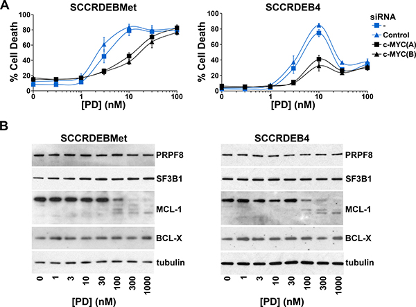 Figure 4: In cSCC cells endogenous c-MYC confers sensitivity to the SF3B1 inhibitor pladienolide B. (A) SCCRDEBMet and SCCRDEB4 cells were mock transfected (-) or transfected with the indicated siRNAs 24 hours prior to incubation with pladienolide B (PD). The percentage of dead cells was determined by real-time imaging. Values are the mean −/+ SEM of three independent experiments. Knockdown of c-MYC increased resistance to pladienolide B-induced death. (B) SCCRDEBMet and SCCRDEB4 cells were treated with pladienolide B (PD) and protein expression was analysed by western blotting. Full-length MCL-1 expression was reduced only at a relatively high pladienolide B concentration which was more than 10-fold greater than required to kill cSCC cells and at which cell death was not affected by c-MYC depletion.