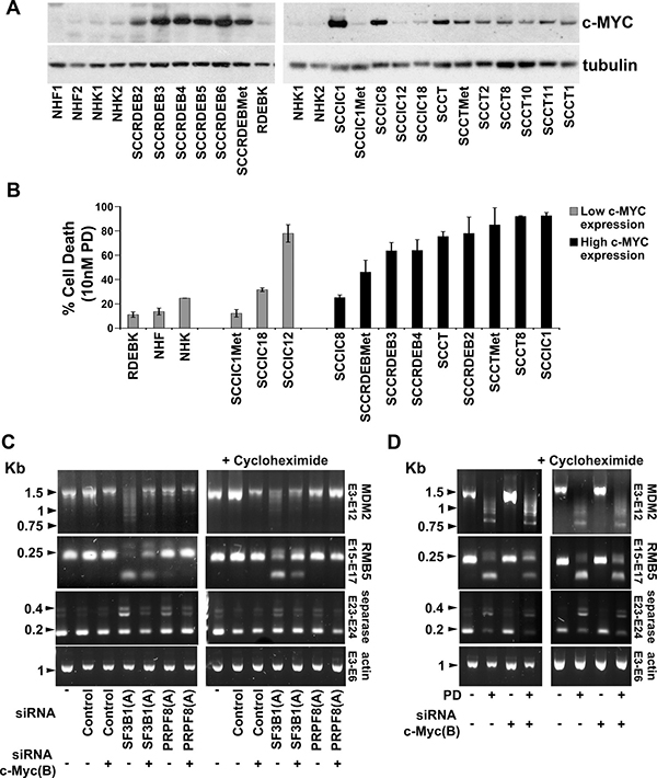 Figure 5: c-MYC is upregulated in cSCC cell lines and promotes altered splicing following interference with the spliceosome. (A) c-MYC protein expression in normal skin cells (NHF, NHK and RDEBK) and a panel of cSCC cell lines was analysed 72 hours after plating. NHF1 and 2 and NHK1 and 2 were from different donors. c-MYC protein expression was higher in cSCC cells compared to normal cells with the exception of SCCIC1Met, SCCIC12 and SCCIC18 cell lines. (B) Cell death at 10 nM pladienolide B (taken from Figure 2). Normal cells and two of the three cSCC cell lines with low c-MYC expression were relatively resistant to pladienolide B. (C) SCCRDEBMet cells were transfected with the indicated combinations of siRNAs. RNA was extracted 48 hours after transfection. One set of cells were treated with cycloheximide (20 μg/ml) 6 hours before harvesting to inhibit NMD (right panel). PCR was carried out using primers complementary to the indicated exons (E). (D) SCCRDEBMet cells were transfected with non-targeting siRNA (Control) or siRNA c-MYC (B) 24 hours before the addition of 10 nM pladienolide B (PD). One set of cells was treated with cycloheximide 6 hours before the end of the incubation (right panel). Samples were harvested for RNA extraction 24 hours after the initiation of pladienolide B treatment. c-MYC knockdown partially reversed alterations in mRNA splicing caused by interference with the spliceosome.