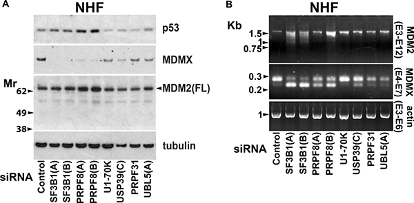 Figure 7: Altered MDM2 mRNA splicing is selectively caused by suppression of SF3B1. NHF were transfected with siRNAs targeting the indicated splicing factors. Samples were analysed 48 hours after transfection. (A) Western blot analysis. Splicing factor knockdown reduced MDMX protein expression. (B) PCR analysis. With the exception of U1-70K, suppression of splicing factors altered the ratio of alternatively spliced forms of MDMX. Only SF3B1 knockdown altered splicing of MDM2 mRNA.