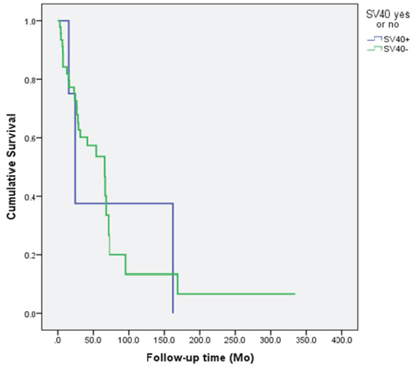 Figure 2: The survival of the patients according to the SV40 status of the head and neck cancer. The presence of SV40 had no effect on the patient’s survival (p=0.894).