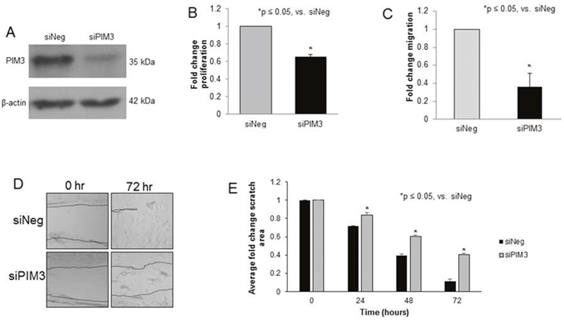 SiRNA was utilized to target PIM3 (siPIM3). Western blotting confirmed that pooled siPIM3 decreased expression of PIM3 in HuH6 cells (Figure 2A). Data regarding individual pool members’ effect on PIM3 expression and proliferation is included as Supplementary Materials (Supplementary Figure 1). Proliferation decreased 34% in HuH6 cells transfected with siPIM3 compared to siNeg controls (p = 0.01, Figure 2B). When examining migration, HuH6 cells transfected with siPIM3 exhibited 63% less migration through Transwell inserts compared to siNeg controls (p < 0.05, Figure 2C). These results were confirmed with a cell monolayer wounding assay in which HuH6 cells transfected with siPIM3 crossed the wounded monolayer significantly less than siNeg cells (Figure 2D, 2E). On average, 41% of the scratch remained free of cells on the siPIM3 plates at 72 hours compared to only 11% on the siNeg plates. siRNA targeting the other members of the PIM family, PIM1 and PIM2, in HuH6 cells revealed a decrease in protein expression with no significant change in cell proliferation (Supplementary Figure 2).