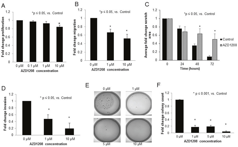 Figure 3: PIM kinase inhibition with AZD1208 decreased proliferation, migration, invasion, and attachment-independent growth in HuH6 hepatoblastoma cells. (A) Following 24 hours of treatment with 10 μM AZD1208, the proliferation of HuH6 cells measured with CellTiter 96® assay was significantly decreased compared to the control. (B) HuH6 cells treated with increasing doses of AZD1208 were allowed to migrate for 24 hours then fixed, stained, and counted. HuH6 cells treated with AZD1208 exhibited significantly decreased migration compared to untreated cells. (C) HuH6 cells were plated and allowed to reach 80% confluence. The media was changed for fresh untreated or treated (10 μM AZD1208) media and a standard scratch was placed on the plate using a 200 μL pipette tip. Scratches were imaged every 24 hours up to 72 hours. Area of the scratch remaining was quantified in pixels using ImageJ software with data reported as fold change in scratch area ± SEM. (D) For invasion, AZD1208 treated cells were allowed to invade for 24 hours, then fixed, stained, and counted. Cells treated with AZD1208 had significantly decreased invasion compared to untreated cells. (E) Soft agar assays were used to assess attachment-independent growth. HuH6 cells were treated with increasing concentrations of AZD1208, grown in soft agar for 1 month, and colonies were imaged and counted. Representative photographs of plates show decreased numbers of colonies in AZD1208 treated versus control plates. (F) Soft agar colonies were quantified with ImageJ. Colony count was significantly decreased with AZD1208 treated compared to untreated cells. All experiments were repeated at least in triplicate and data reported as fold change ± SEM.