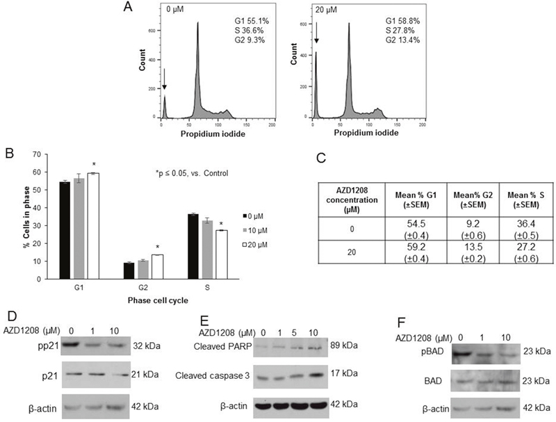 Figure 4: AZD1208 prevented progression through the cell cycle and led to apoptosis in HuH6 hepatoblastoma cells. (A) Cells were treated with 0, 10 or 20 μM AZD1208 for 72 hours and cell cycle was analyzed with propidium iodide staining using flow cytometry. Representative histograms showing relative percentage of cells in each phase of the cell cycle show that there was a decrease in S phase and increase in G1 and G2 phases with PIM inhibition. There was also an increase in the sub-G1 population (indicated by the arrow, 23.4% versus 12.7% of the total histogram) in cells treated with AZD1208 versus control. (B) Quantification of average percent cells in each phase of the cell cycle across all replicates revealed a significant decrease in S phase, and increase in G1 and G2 phases in cells treated with 20 μM AZD1208 compared to control. (C) Tabular representation of the average percent cells in each phase of the cell cycle across all replicates revealing a significant decrease in S phase, increase in G1 phase, and increase in G2 phase in cells treated with 20 μM AZD1208 compared to control. Data represent the mean ± SEM. (D) Immunoblotting for phospho-p21 (T145) and total p21 in HuH6 cells showed a decrease in p21 phosphorylation with 24 hour AZD1208 treatment with no accompanying change in total p21 protein. (E) Immunoblotting for cleaved PARP and cleaved caspase 3, markers of apoptosis, in HuH6 cells revealed an increase in cleaved products in both markers with increasing concentrations of AZD1208 at 24 hours. (F) Immunoblotting for phospho-BAD (S112) in HuH6 cells showed that BAD phosphorylation was decreased with AZD1208 at 24 hours whereas there was no change in total BAD; evidence for apoptosis.