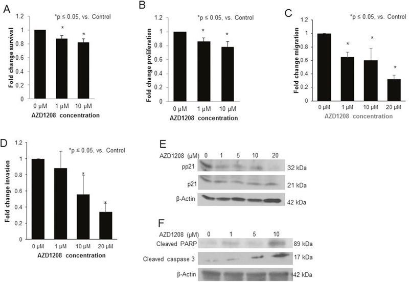 Figure 7: PIM kinase inhibition with AZD1208 decreased survival, proliferation, migration, and invasion, affected phosphorylation of p21, and induced apoptosis in the hepatoblastoma PDX, COA67. (A) Following 24 hours of treatment with AZD1208, the survival of COA67 cells was assessed with the alamarBlue® Assay. Cells treated with AZD1208 had significantly decreased viability compared to the control cells. (B) Following 24 hours of treatment with AZD1208, the proliferation of COA67 cells was assessed. Cells treated with AZD1208 had significantly decreased proliferation compared to the control cells, reported as fold change ± SEM. (C) COA67 cells treated with increasing doses of AZD1208 were allowed to migrate through a micropore membrane for 72 hours. Migration was reported as fold change. COA67 cells treated with AZD1208 exhibited significantly decreased migration compared to untreated cells. (D) For invasion, AZD1208-treated cells were allowed to invade for 72 hours. Cells treated with AZD1208 exhibited significantly decreased invasion compared to untreated cells. All experiments were repeated at least in triplicate, with results reported as fold change ± SEM. (E) Immunoblotting for phospho-p21 (T145) and total p21 in COA67 cells showed a decrease in phospho-p21 with AZD1208 treatment with no accompanying change in total p21. (F) Immunoblotting for cleaved PARP and cleaved caspase 3, markers of apoptosis, in COA67 cells revealed an increase in both markers with increasing concentrations of AZD1208.