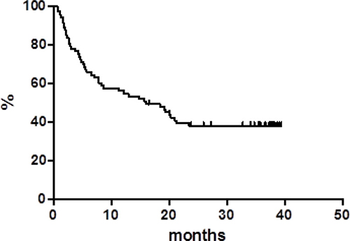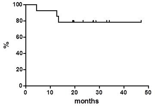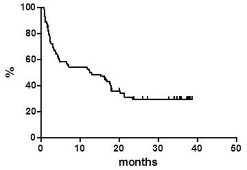 Globally, at a median follow up of 38 months, OS was 37.8% at 40 months (Figure 1) with a median of 16 months. PFS at 40 months was 30% and the median was reached at 12.9 months (Figure 2). Disease free survival (DFS) was 78.6% at 48 months (Figure 3) since 3 (21.4%) out of 14 CR patients relapsed while 11 patients were in continuous CR (CCR) at the latest follow up, with a median DoR of 36 months; among these patients, three received a transplant consolidation (1 with ASCT and 2 with allogeneic transplant [alloSCT]). The DoR was 79.2% at 40 months (Figure 4).