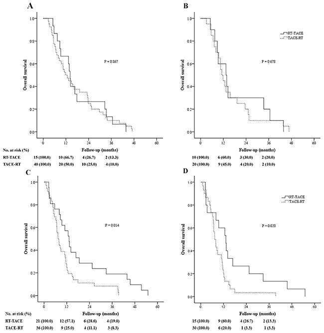 The median follow-up was 11 months (range, 2-48 months) for the TACE-RT group and 14 months (range, 2-55 months) for the RT-TACE group. Collectively, all of the patients in the RT-TACE and TACE-RT group died during the study period. Thirty-eight (50.0%) of the 76 patients in the TACE-RT group and 25 (69.4%) of the 36 patients in the RT-TACE group underwent repeated TACE, with a mean of 1.9 (range, 1–9) and 3.1 (range, 1–12) TACE procedures per patient in the two groups of patients, respectively.