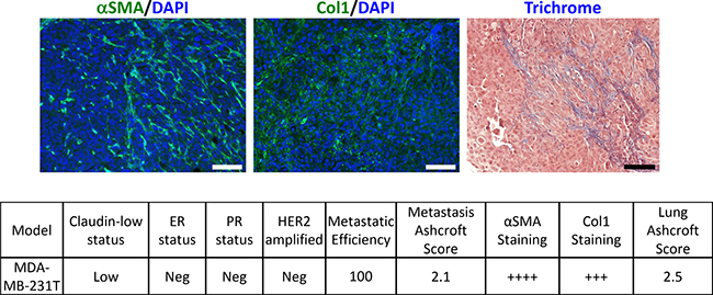 Figure 2: Analysis of fibrosis in metastatic lung tissue from human MDA-MB-231T cells. FFPE lung tissue sections were stained for alpha smooth muscle actin (αSMA), Collagen 1 (Col1) or Masson’s trichrome to quantify fibrosis in lung metastases from this cell line. Characteristics of the model are listed. Images were taken at 20× objective and scale bar = 100 μm.