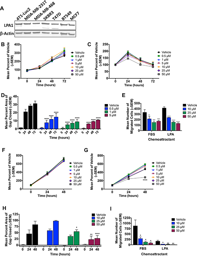 Figure 3: SAR100842 reduced migration and motility of breast cancer cell lines in vitro. (A) Western blot analysis of breast cancer cell lines for LPA1 expression with β-actin as a loading control. (B–C) Viability of human triple-negative MDA-MB-231T cells with increasing doses of SAR100842 over time in the presence of 10% serum (B) or serum-free media (C). (D) MDA-MB-231T cells were measured for the ability to migrate and close a scratch gap in a wound healing assay in the presence of vehicle or increasing concentrations of SAR100842. Percent area of gap that was closed was determined at 24,48 and 72 hours. Two-way ANOVA, p < 0.0001 for all concentrations at all time points staring at 24 hours post scratch. (E) MDA-MB-231T cells were treated with SAR100842 for 24 hours then plated in a Boyden chamber motility assay and allowed to migrate through a collagen-coated membrane toward either 1% fetal bovine serum (FBS) or 5 μM lysophosphatidic acid (LPA) for 4 hours. ANOVA, p = 0.0058, p = 0.0003, p = 0.0004 for 10 μM, 25 μM and 50 μM respectively to FBS. P < 0.0001 for all concentrations to LPA. (F–G) Viability of murine 4T1-Luc2 mammary carcinoma cells with increasing doses of SAR100842 over time in the presence of 10% serum (F) or serum free media (G). p < 0.0001 for 50 μM SAR100842 at 48 hours in serum-free media. (H) 4T1-Luc2 cells were measured for the ability to migrate and close a scratch gap in a wound healing assay in the presence of vehicle or increasing concentrations of SAR100842. Two-way ANOVA, p = 0.011 for 25 μM at 48 hours, p = 0.002 and p < 0.0001 for 50 μM at 24 and 48 hours, respectively. (I) 4T1-Luc2 cells were treated with SAR100842 for 24 hours then plated in a Boyden chamber motility assay and allowed to migrate through a collagen coated membrane toward either 5% FBS or 10 μM LPA for 4 hours. ANOVA, p = 0.04, p = 0.02, p = 0.01 with 10 μM, 25 μM and 50 μM respectively to FBS and p = 0.02, p = 0.008, p = 0.007 with 10 μM, 25 μM and 50 μM respectively to LPA. All experiments repeated 3-4 times.