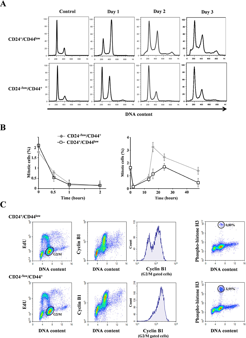 Figure 3: Analysis of cell cycle distribution in CD24+/CD44low cells and CD24−/low/CD44+ cells after 10 Gy irradiation. (A) Cell cycle analysis of 10 Gy-irradiated cells over 3 days. Similar results were obtained in at least 3 different experiments. (B) Mitotic index using phospho-histone H3 labelling at different times after 10 Gy irradiation: left 0–2 hours and right 0–48 hours after irradiation. Mean and SD of 4 independent experiments are presented. (C) Cyclin B1 and EdU labellings 16 hours after irradiation. Histograms of cyclin B1 were obtained from G2M cells (gated in the EdU/DNA content panel). Similar results were obtained in 2 different experiments. On the right, from the same sample, mitosis characterization using phospho-histone H3 labelling.