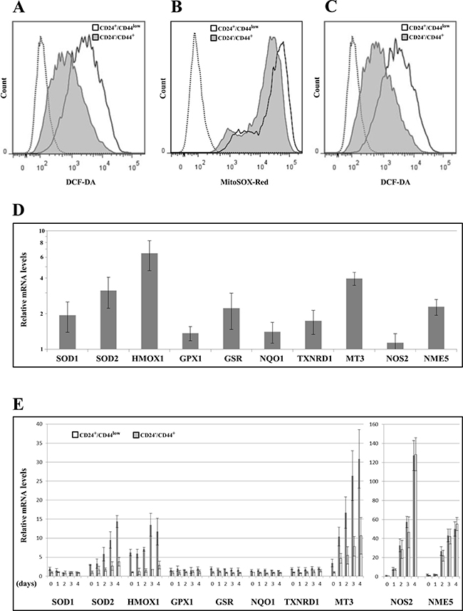 Figure 5: Analyses of ROS levels and expression of oxidative stress-related genes in CD24+/CD44low cells and CD24−/low/CD44+ cells. (A) Basal intracellular ROS concentrations were measured by DCF-DA staining, (---- negative control without DCF-DA probe). The flow cytometry analysis shown is representative of 3 independent experiments. (B) As in (A) but using MitoSOX red instead of DCF-DA (---- negative control without MitoSOX red probe). (C) As in (A) but 2 days after 10 Gy irradiation. (D) Analysis by qRT-PCR of the relative expression of the mRNAs encoding stress-related genes. Normalization was performed as indicated in Materials and Methods. For each gene, expression in CD24+/CD44low cells was normalized to 1 and the ratio of relative mRNA level of CD24−/low/CD44+ cells to CD24+/CD44low cells was presented. Each value corresponds to the mean value of at least 2 independent PCRs performed from 3 independent experiments. Error bars correspond to SEM. (E) Analysis by qRT-PCR of the relative expression of the mRNAs encoding stress-related genes during 4 days after 10 Gy irradiation. Normalization was performed as indicated in Materials and Methods. For each gene, expression at day 0 in CD24+/CD44low cells was normalized to 1.