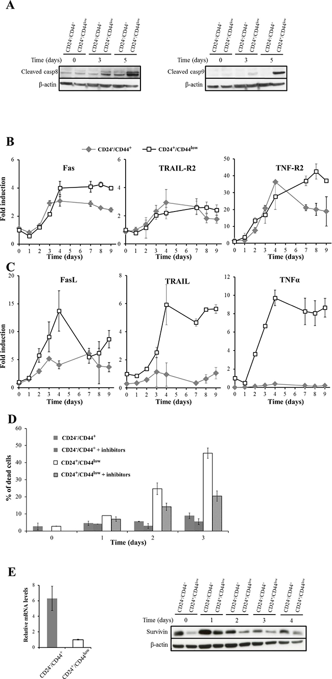 Figure 6: Role of death receptor pathways in radiation-induced cell death of CD24+/CD44low cells and CD24−/low/CD44+ cells. (A) Kinetics of cleavage of caspases 8 and 9 at different times after 10 Gy irradiation. The Western blots shown are representative of 3 independent experiments. (B) and (C) mRNA levels of death receptors and corresponding ligands after a 10 Gy irradiation of CD24+/CD44low cells and CD24−/low/CD44+ cells. These mRNA levels were determined by quantitative RT-PCR. Normalization was performed as indicated in Materials and Methods and the basal expression of CD24+/CD44low cells on day 0 was normalized to 1. Each value corresponds to the mean value of at least 2 independent PCRs performed from 3 independent experiments. Error bars correspond to standard deviation. (D) Neutralization of the death receptor pathways reduces radiation-induced apoptosis. CD24+/CD44low cells and CD24−/low/CD44+ cells were 10 Gy-irradiated and treated or not with a combination of Fas/Fc, TRAIL-R1/Fc and TNF-R1/Fc chimera (250 ng/mL, 100 ng/mL and 100 ng/mL, respectively). These chimeras, which are cytokines designed to neutralize apoptosis induced by the corresponding ligand, were added to the culture medium at days 0 and 2. Viable and dead cells were counted after trypan blue staining. Results correspond to the mean ± standard deviation of 3 independent experiments. (E) Survivin expression by quantitative RT-PCR (left) and Western blot (right) after a 10 Gy irradiation of CD24+/CD44low cells and CD24−/low/CD44+ cells. For RT-PCR, normalization was performed as indicated above, and the Western blot shown is representative of 3 independent experiments.