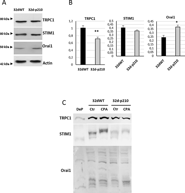 Figure 4: SOC constituents in 32d cells. (A) Expression of TRPC1, Orai1 and STIM1 in 32dWT and 32d-p210 cells. Cell lysates were loaded in 8% SDS-PAGE gel and western blot analysis were performed using β-actin as a loading control. (B) Quantification of proteins expression from 13 independent experiments using GeneTools image analysis 4.3.5 Software. **P < 0.005. (C) Phosphorylation state of TRPC1/Orai1/ STIM1. Phosphorylated proteins were revealed by the PhosTag™ molecules, which are able to interact with phosphate. PhosTag™ were introduced to the separation SDS-PAGE gel and delayed phosphoprotein migration. Each phosphorylated form could be separated and visualized with specific antibodies in Western Blot. Dephosphorylated (DeP) form of proteins of interest was used as a negative control. Cells were lysate after incubation in 1.8 mM Ca2+ buffer (Ctr) or after ER depletion (0 mM Ca2+-15 μM CPA during 7 minutes) (CPA).
