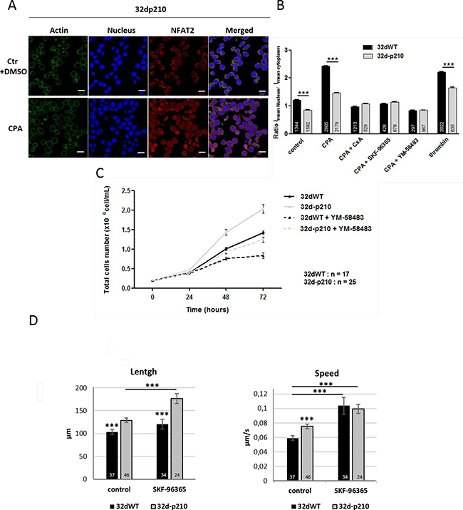 Figure 5: SOCE dependent cellular processes. (A) NFAT2 translocation in 32d-p210 cells. Immunostaining of actin (Phalloidin, green), nucleus (TOPRO, blue) and NFTA2 (red) were done in 1.8 mM Ca2+ buffer + DMSO (ctr) or in 1.8 mM Ca2+ buffer-15 μM CPA (CPA) for 30 minutes”. Images were obtained using confocal microscopy; bar = 10 μm. (B) Quantification of NFAT2 translocation from cytoplasm to nucleus by analyzing nucleus/cytoplasm ratio of NFAT2 means intensity in 32dWT (dark) and 32d-p210 (grey) cells. Cells were fixed after incubation in 1.8 mM Ca2+ buffer + DMSO (ctr) for 30 minutes or after stimulation with 0 mM Ca2+ buffer-15 μM CPA for 7 minutes prior to 1.8 mM Ca2+ buffer-15 μM CPA for 30 min (CPA). Alternatively, cell were stimulated with 1 U/ml thrombin for 30 minutes. Cells were pre-treated with 1 μM CsA for 30 minutes (CPA+CsA), or treated with 40 μM SKF-96365 (CPA+SKF-96365) or 10 μM YM-58483 (CPA+YM-58483) during incubation 1.8 mM Ca2+-15 μM. CPA for 30 minutes. Bar graphs represent mean rates of nucleus/cytoplasm ratio of NFAT2 means intensity ± SEM. ***P < 0.001. (C) Proliferation rate of 32dWT and 32d-p210 in normal medium with or without 10 μM YM-58483. Cells viability was estimated with trypan blue coloration at 24, 48 and 72 hours of incubation. (D) Cell migration was quantified by tracking analyzed using Imaris software. Total length and mean speed of each cell were measured in normal medium supplemented or not with 40 μM SKF-96365. Cell migration was recorded at 37° C for 30 minutes using the spinning disk confocal microscope (Olympus IX81-ZDC).