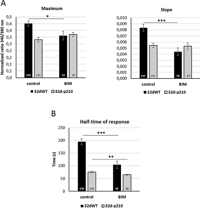 Figure 7: Role of PKC in calcium influxes. (A) SOCE quantification with or without PKC inhibitor (BIM) in 32dWT (dark) and 32d-p210 (grey) cells. Cells were incubated or not with a PKC inhibitor BIM (10 μM for 30 minutes before CPA treatment) in 1.8 mM Ca2+ buffer. SOCs activation protocol was performed and SOCE were measured by the maximum (340/380 nm fluorescence ratio; left panel) and the speed of entries (initial slope; right panel). (B) Thrombin-induced Ca2+ entry quantification with or without PKC inhibitor (BIM) in 32dWT (dark) and 32d-p210 (grey) cells (half-time of response in seconds). Cells were incubated or not in 1.8 mM Ca2+ -10 μM BIM for 30 minutes before CPA treatment, and 1.8 mM Ca2+-1 U/ml thrombin buffer was added. Bar graphs represent mean rates ± SEM. ***P < 0.001.