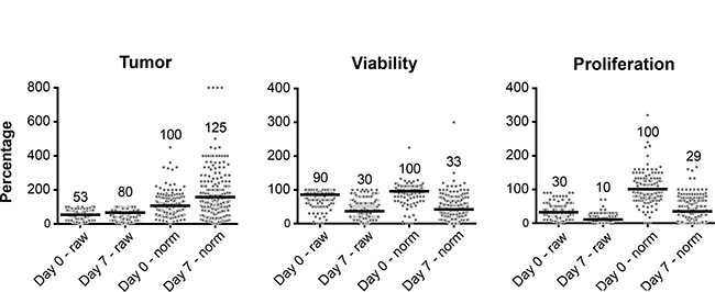 The scoring results are presented in this manuscript as either raw or normalized data. Raw data were used to present the actual success of the histoculture technique. Normalized data were used for the analyses between patients. To normalize the data per patient, median percentages (tumor, viability and proliferation) at day 0 were calculated. Consequently, all single fragment scoring percentages at day 0 and day 7, were normalized against this median value at day 0. These data will further be referred to as the ‘normalized data’. This analysis method was done in order to deal with the tissue heterogeneity issues that exist within HNSCC and therefore this method corrects for the variability between the fragments at day 0. Beside this, we were now also capable of comparing data between patients.