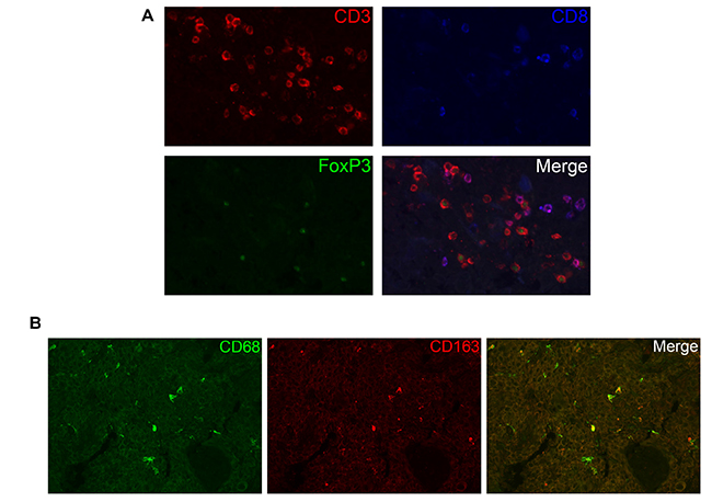 The EGFR expression was scored as percentage of positive tumor cells. The T-cell and macrophage subpopulations, as determined by multiparameter fluorescent IHC, were scored as number of cells per mm2 in the total tumor section.