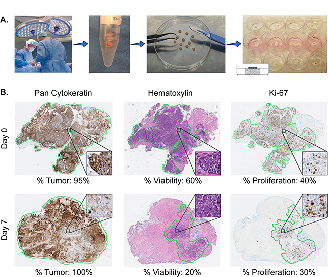 Ki-67 was used to determine the proliferation rate of the viable cancer cells (see % Proliferation Figure 4B). Therefore, for each successfully cultured fragment, three percentages were scored. An example of our scoring system is shown in Figure 4B.
