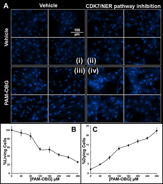 Primary glioma cells were incubated with an MGMT substrate, either O6BG or PAM-OBG, for a defined time period and then 100 μM O6PGG was added, and 10 minutes later the cells were fixed with paraformaldehyde (PFA). Following permeabilization and washing, thioether-propargyl MGMT was covalently linked to FITC-PEG-azide using Cu(II). Figure 3C (i) shows a representative cell field and the green fluorescence labels active MGMT, and blue DAPI signal, DNA.