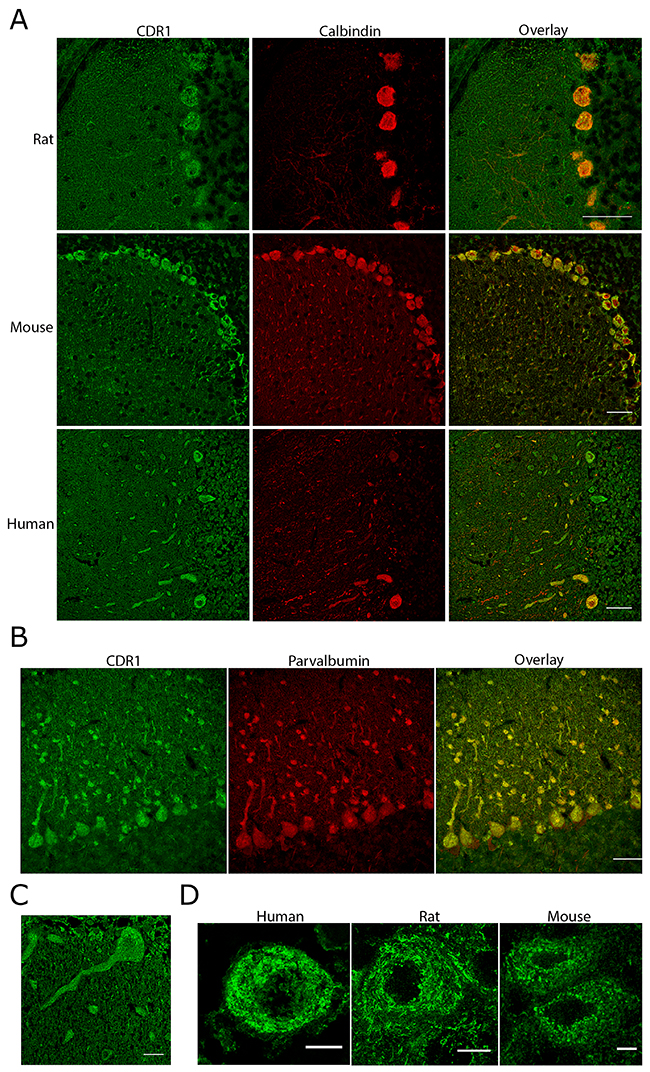 Figure 2: CDR1 is expressed in soma and dendrites of Purkinje cells in rat, mouse, and human. (A) Chicken CDR1 antibody binds strongly to the Purkinje cells in rat, mouse, and human cerebellum. Staining of interneurons in the molecular layer is also observed. Scale bar 50 μm. (B) Co-staining of rat cerebellum with parvalbumin and CDR1 shows that CDR1 is expressed in interneurons of the molecular layer. Scale bar 50 μm. (C) CDR1 expression in human Purkinje cell soma and dendrites. Scale bar 20 μm. (D) CDR1 is expressed in distinct ring-like structures in the soma of Purkinje cells in human, rat, and mouse. An inner ring is localized just outside the nucleus and a second ring is localized close to the plasma membrane. Scale bar 10 μm. All images are taken using a Leica SP2.