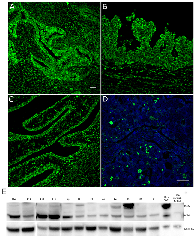 Figure 3: CDR1 is strongly expressed in solid glands in ovarian tumor tissue. (A) An ovarian tumor section from a patient with high grade serous carcinoma (HGSC), FIGO stage IIIc, PCD and Yo antibodies showed strong CDR1 staining in tumor glands. Surrounding stromal cells showed weaker staining. (B) In a section from a patient with HGSC, FIGO IIIc, no PCD, and no Yo antibodies, cancer cells in the epithelial lining stained strongly for CDR1. (C) CDR1 staining of the epithelial lining was also observed in a section from a patient with HGSC of unknown differentiation that had no Yo antibodies and no PCD. (D) Strong staining for CDR1 was also observed in the tumor from a patient with clear cell ovarian carcinoma, FIGO stage 1A. Nuclei were stained with Dapi. (E) Western blot of human ovarian lysates. All lysates expressed the 37-kDa version of CDR1, while a 45-kDa isoform was present in three lysates (P3, P4 and P8). β-tubulin was used as loading control. The image is merged from two gels run in the same setup. Merged sites are shown as black lines. Image a) was taken with 20x objective and images b), c), and d) were taken with a 40x objective on Leica SP2. Scale bar 50 μm.