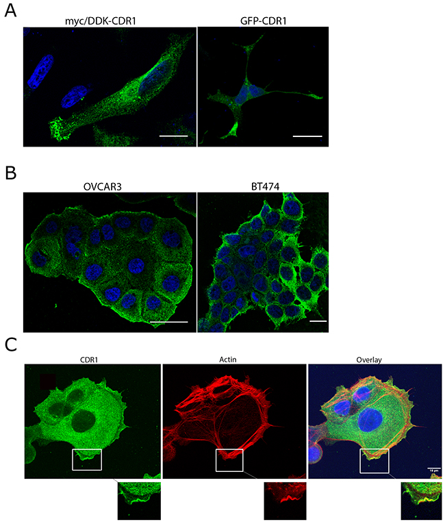 Figure 4: CDR1 expression in cancer cell lines. (A) Overexpression of myc/DDK-CDR1 in transfected HeLa cells: Left image: Hela cells transfected with myc/DDK-CDR1 (18 h transfection) and stained with anti-myc (green). CDR1 accumulates in the front-line of the cell. Right image: Cells transfected with CDR1-GFP (24 h transfection). CDR1 accumulates in the protrusions of the cell. Scale bar 20 μm. (B) Both OVCAR3 and BT474 express CDR1 endogenously. The staining is stronger in the cells making the outer border of the cell colony. (C) Endogenous CDR1 expression (green) in OVCAR3 cells co-stained with the actin marker phalloidin (red). CDR1 is strongly expressed close to the plasma membrane and in the cytoplasm. CDR1 is not present in an area between the cortical actin and the outer membrane ruffles. However, CDR1 is expressed in the membrane protrusions where actin is involved in lamellipodia/filopodia formation. Main images are flattened images of the stack. Boxed areas are zoom in on a single section if the confocal plane. CDR1 co-localizes with actin in the membrane ruffles. Scale bar 10 μm. Nuclei are stained with DAPI (blue).