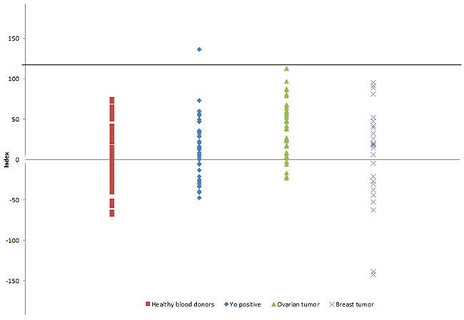 Figure 5: CDR1 indexes in patient sera from patients with PCD and Yo antibodies, patients with ovarian cancer without neurological symptoms, and patients with breast tumor without neurological symptoms. Only one patient with PCD and Yo antibodies was positive for CDR1 antibodies. Black line indicates cut-off.