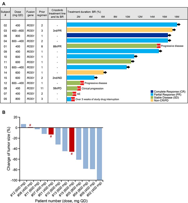 Of the 15 patients, 12 had measurable tumor lesions and of those, nine were crizotinib treatment naïve. The ORRs were 58.3% (seven partial responses [PRs]) and 66.7% (six PRs), respectively. The disease control rate (DCR) was 100% in both groups (Figure 2A). Tumor size reduction was observed in all dose groups (Figure 2B). The median treatment duration was 10 months with one patient able to continue for more than 18 months (#02). In the 800 mg cohort, one of the three patients with no target lesion had a complete response (CR) (Figure 2A). Among crizotinib-pretreated patients, the ORR was 33.3% (one PR) and the DCR was 100% (one PR, two with stable disease (SD)). Three patients underwent a dose reduction because of one of the following: patient request and malaise, increased ALT level, or malaise (Figure 2A).