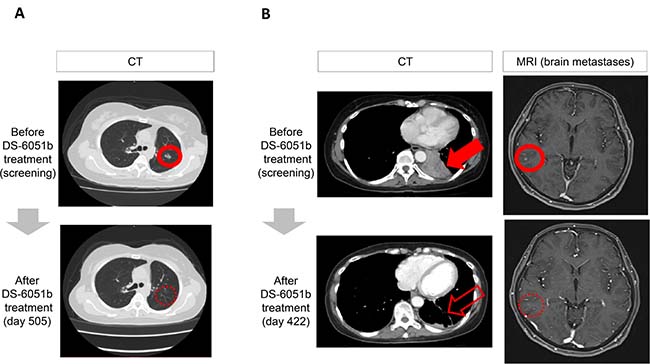 Two patients withdrew from the study due to toxicity, one because of a grade 3 AST/ALT increase, and one because of grade 5 interstitial lung disease. The latter patient had a pretreatment history of carboplatin + bevacizumab + pemetrexed and avelumab, and this event occurred 40 days after the first 400 mg dose of DS-6051b. Despite treatment with prednisolone, the patient died after 2 months. The death was deemed due to progressive disease, but it may be attributable to interstitial lung disease.