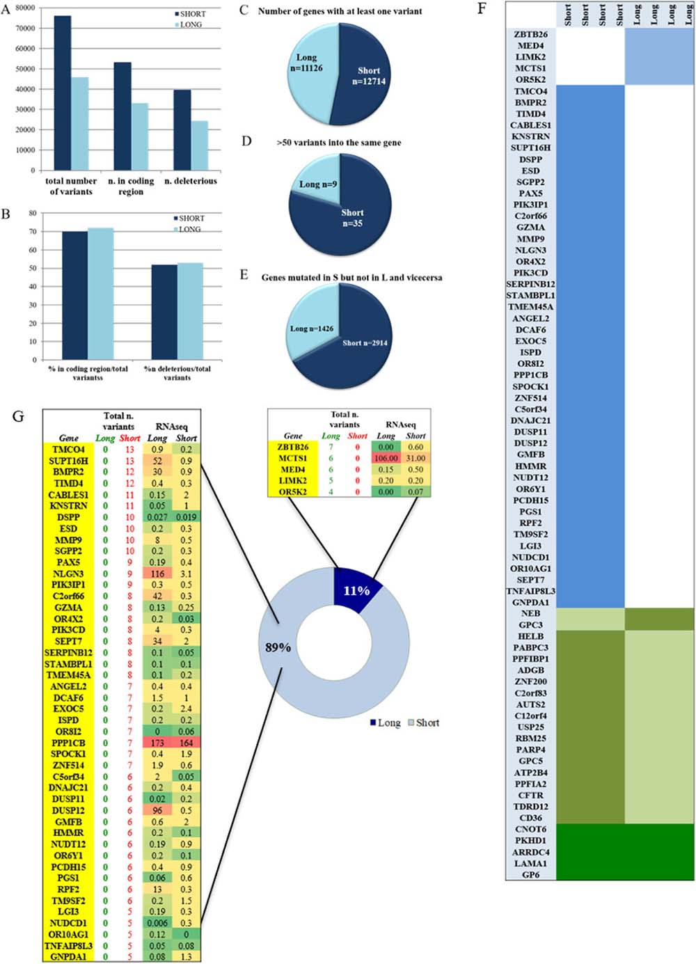 Overall, a hyper mutational status was observed significantly higher in the S group where 35/12714 genes contained more than 50 variants compared to 9/11126 in the L group with a P = 0.0005 (Figure 1D). The number of genes that were exclusively carrying a variant in the S group but not in the L group was 2914 compared to 1426 genes in the L group with a statistical significant P ≤ 0.0001 (Figure 1E).