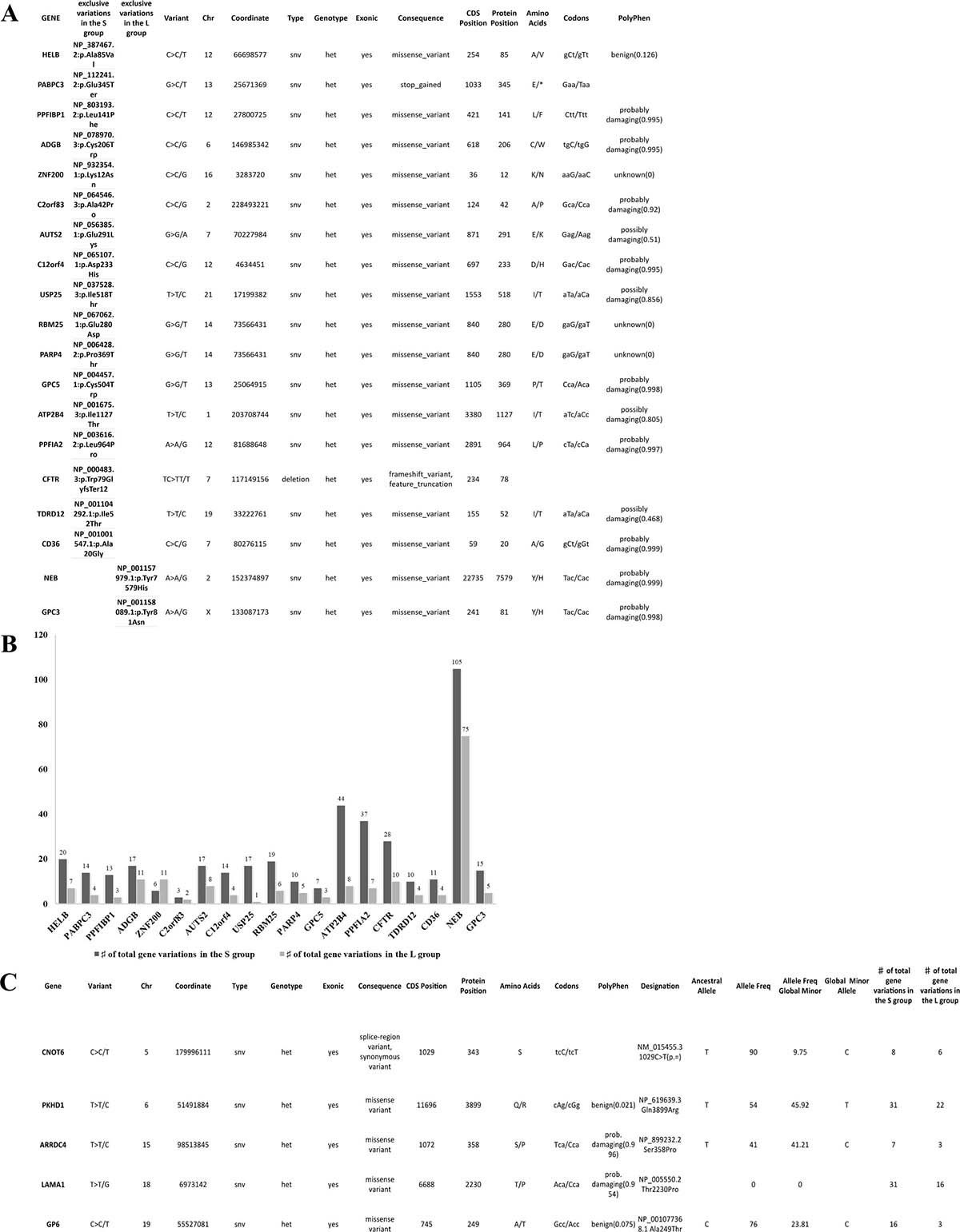 The S group carried at least one variant in 12714 genes, while the L group in 11126 genes with a statistical significant difference (P < 0.0001) as shown in Figure 1C.