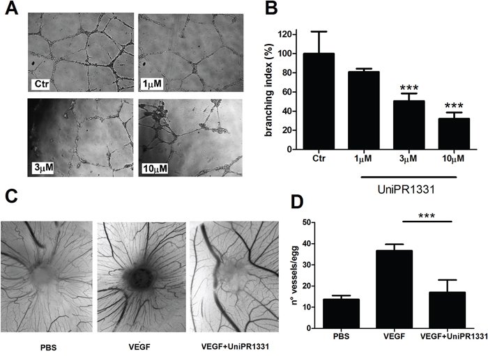 Figure 1: Effect of UniPR1331 on angiogenesis. (A) representative pictures at 10x magnification. (B) Quantification of HBMVE cells tube formation as branching index analysis. (C) in vivo angiogenic assay. CAMs were implanted with alginate plugs adsorbed with or without VEGF and the compound. After 72 h the angiogenic response was scored. Representative photographs of CAMs incubated with/without VEGF in the absence or in the presence of 10μM UniPR1331. (D) Count of the number of vessels/egg in presence of VEGF (positive control) and after inhibition with 10 μM UniPR1331. Data are the mean ± SEM of 3 independent experiments ***: p<0.001, one-way ANOVA followed by Dunnett’s post-hoc test.