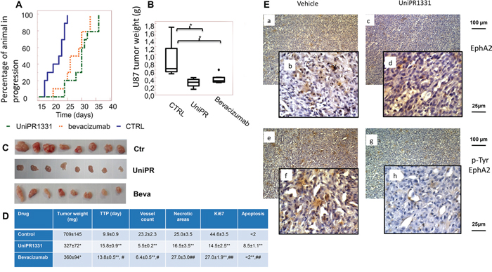 Figure 2: UniPR1331 blocks in vivo U87MG growth. CD1 nude mice were subcutaneously injected with U87MG tumor cells and orally treated with 30 mg/kg UniPR1331, five days a week for five weeks. Tumor growth was assessed two times a week by measuring tumor diameters with a Vernier caliper. Bevacizumab (4 mg/kg iv every 4 days) was used as reference compound. (A) Kaplan-Meier curves generated for the comparisons of Bevacizumab, UniPR1331 and ctr. (B) Comparisons amongst treatments in terms of tumor weight, (C) Pictures of xenografted tumors. (D) Table reporting multiple parameters of the experiment. (E) Immunostaining performed on U87MG xenograft tissues collected from Vehicle-treated and UniPR1331-treated animals on total EphA2 and phospho-tyr-EphA2 expression *, ** p<0,05 or p<0.01 vs controls #, ## p<0,05 or p<0.01 UniPR1331 vs Bevacizumab, n=10.