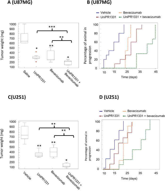 Figure 3: Combination between UniPR1331 and bevacizumab in GBM grafts. CD1 nude mice were subcutaneously injected with either U87MG or U251MG tumor cells and treated with 30 mg/kg UniPR1331 os 5 days a week, 4 mg/kg Bevacizumab iv every 4 days or their combination for 30 days. Tumor growth was assessed two times a week by measuring tumor diameters with a Vernier caliper. (A) Comparisons amongst treatments in terms of tumor weight in U87MG grafts. (B) Kaplan-Meier curves were generated for the comparisons of control (ctr)- Bevacizumab- UniPR1331- and combination of Bevacizumab plus UniPR1331 in experimentation with U87MG cells. (C) Comparisons amongst treatments in terms of tumor weight in U251 grafts. (D) Kaplan-Meier curves were generated for the comparisons of control (ctr)- Bevacizumab- UniPR1331- and combination of Bevacizumab plus UniPR1331 in experimentation with U251MG cells. n=10.