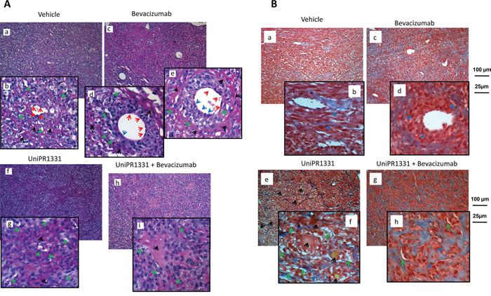 Figure 4: In vivo VM and angiogenesis from U87MG tumors. (A) Periodic Acid-Schiff (PAS) staining: glycols are oxidized to aldehydes with subsequent formation of pararosaniline adducts which are stained in pink/red (black arrows). PAS stains the basal membrane underlying the vascular endothelium and delimits vasculo-mimetic structure. Subpanels a, b (vehicle treated animals) show main and detailed framework with endothelial cells (red arrows) delimiting a central small-sized blood capillary. Small vasculo-mimetic micro-capillaries (green arrows) are distributed uniformly in the tumor parenchyma. Subpanels c-e show PAS staining in Bevacizumab treated animals in which we have reduction of vessel number (subpanel c) and a switch from angiogenesis to vasculogenic mimicry starting from single medium-sized vessels (subpanel e blue arrows). We analyzed the two largest vessels in detail (subpanels d, e). Subpanels f, g: PAS staining in UniPR1331-treated animals showing a significant reduction in the number of medium/large-sized vessels as well as of vascular lacunae. Subpanels h, i: The reduced vascularization of the tissues was caused by UniPR1331 alone or co-administered with Bevacizumab. (B) Trichromic staining performed in Vehicle (subpanels a, b) Bevacizumab (subpanels c, d), UniPR1331 (subpanels e, f) and combination Bevacizumab plus UniPR1331 (subpanels g, h). Tumor areas rich in collagen fibers (stained in blue) indicating massive fibrosis colonized and eventually replaced vascular parenchyma of U87MG xenografts mainly in the combination treatment. In addition, in UniPR1331 treated tumors, Masson Trichrome staining highlighted the presence of deposits yellow/orange probably as blood clots following venous thrombi (black arrows).