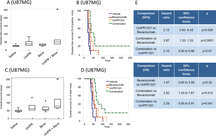 Figure 5: Combination between bevacizumab and UniPR1331 in U87MG orthotopic brain model. CD1 nude mice were intra brain injected with luciferase transfected U87MG cells and treated with 30 mg/kg UniPR1331 os 5 days a week, 4 mg/kg Bevacizumab iv every 4 days or their combination. (A) Comparison amongst treatments in terms of tumor appearance or disease free survival (DFS). (B) Kaplan-Meier curves were generated for the comparisons of control (vehicle)- Bevacizumab- UniPR1331- and combination of Bevacizumab plus UniPR1331 in terms of disease free survival. (C) Comparisons amongst treatments in terms of overall survival. (D) Kaplan-Meier curves were generated for the comparisons of control (vehicle)- Bevacizumab- UniPR1331- and combination of Bevacizumab plus UniPR1331 in terms of overall survival. (E) Statistical analysis: comparison of Kaplan Meier curves for UniPR1331 alone or in combination with Bevacizumab. n=10.