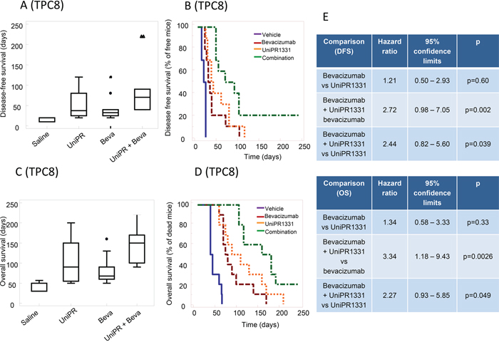 Since EphA2, EphA3 and ephrin-B2 were described to regulate tumor-propagating cell self-renewal [8, 11, 22], luciferase-transfected glioma stem cells (TPC8 cell line) were injected into mouse brains. In these conditions, 30 days treatment with UniPR1331 (52.0 ± 10.2 days) and Bevacizumab (DFS=44.0 ± 10.0 days) significantly (p<0.005) increased the DFS period when compared to control (16.0 ± 1.4 days). Kaplan-Meier curves showed no significant differences amongst single monotherapies (Figure 6A, 6B, 6E) while the association between UniPR1331 and Bevacizumab (DFS=92.5 ± 22.2 days) displayed higher efficacy than treatments with both drugs taken individually. The increased lapse of tumor appearance was associated with a significant increase in median OS (Figure 6C-6D) of treated animals. The analysis of Kaplan-Meier curves indicates that Bevacizumab (OS=82.5 ± 3.6 days) and UniPR1331 (101.5 ± 16.5 days) were effective in the increase of OS of TPC8 bearing animals. UniPR1331 increased the efficacy of Bevacizumab both in terms of mean OS (145.0 ± 15.8 days, p<0.01) and in term of reduction of mice in progression (HR=3.34, p<0.01). This combination resulted also significantly more effective than UniPR1331 administered alone (HR=2.44, p<0.05 for DFS and HR=2.27, p<0.05 for OS) (Figure 6E).