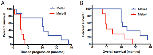 Figure 1: (A) Time to progression and (B) Overall survival of patients in groups Mela-I and Mela-II (Melavak arm).