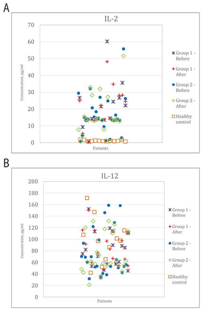 The T-cell effector immune response is realized via polarization of Th1 cells and secretion of IFN-γ, IL-2 and IL-12 cytokines, while the humoral immune response is characterized with the predominance of Th2 cells and cytokines like IL-4 and IL-10. Advanced melanoma patients are known to have Th1/Th2 imbalance and low levels of IFN-γ [1]. IFN-γ is a potent activator of mononuclear cells, it induces and modulates the expression of MHC antigens by macrophages, T-cells and B-cells, and also tumor cell lines [2]. Inhibition of IL-2 causes the accumulation of immunosuppressive substances like gangliosides, which are produced by melanoma cells and inhibit the production of IL-2 by directly damaging the molecules [3, 4]. IL-12 induces Th0-Th1 polarization and Th1-cells secrete IFN-γ. IL-12 family cytokines play the critical role in the differentiation of Th-cells and regulation of immunologic reactivity. Dendritic cells (DC) and macrophages are the major producers of IL-12. There are both positive and negative dynamics of IL-12 during immunotherapy in melanoma patients described earlier [5]. The key role of IL-6 as a negative prognosis factor of overall survival was repeatedly reported [6].