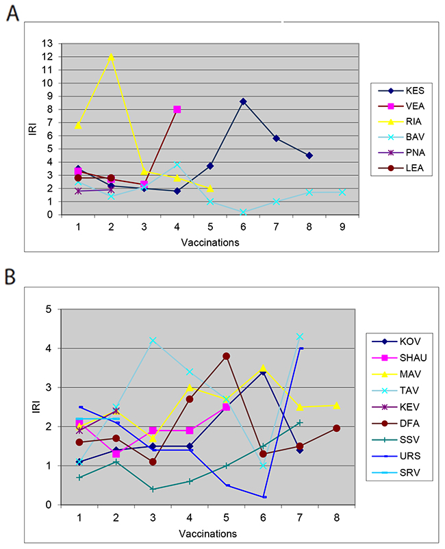 Figure 3: Immunoregulatory index profile in two groups of pati1ents. (A) Change in IRI, Group A. (B) Changes in the IRI Group B.