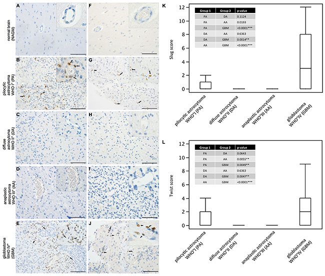 Figure 1: SLUG and TWIST are expressed in pilocytic astrocytomas and glioblastomas in human astrocytic tumors. Immunohistochemical analyses showing SLUG (left column) and TWIST (right column) expression (SLUG and TWIST positive nuclei indicated with black arrows) in (A, F) normal appearing grey matter (NAGM), (B, G) pilocyctic astrocytoma WHO grade I showing vascular proliferations, (C, H) diffuse astrocytoma WHO grade II, (D, I) anaplastic astocytoma WHO grade III and (E, J) glioblastoma WHO grade IV showing vascular proliferations. (Scale bar = 100μm). Box-and-Whisker plots for (K) SLUG and (L) TWIST expression scores are depicted. P-values from all pair comparisons of different WHO grade astrocytomas were obtained using the non-parametric Wilcoxon test followed by Bonferroni post hoc test (p < 0.05 = *; p < 0.01 = **; p < 0.0001 = ***). Pilocytic astrocytoma, WHO grade I (PA; n=47); diffuse astrocytoma WHO grade II (DA; n=16); anaplastic astrocytoma WHO grade III (AA; n=35); glioblastoma WHO grade IV (GBM; n=252).