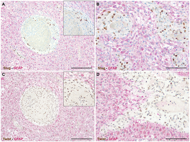 Figure 2: EMT factors are exclusively restricted to vascular proliferations in human astrocytomas. Double immunohistochemistry for GFAP (red) and (A, B) SLUG (brown) as well as (C, D) TWIST (brown) indicating that all cells expressing the EMT transcriptions factors are GFAP-negative and are located within abnormal vascular complexes. (insets: higher magnifications; scale bar in A, C = 200μm and in B, D = 100μm).