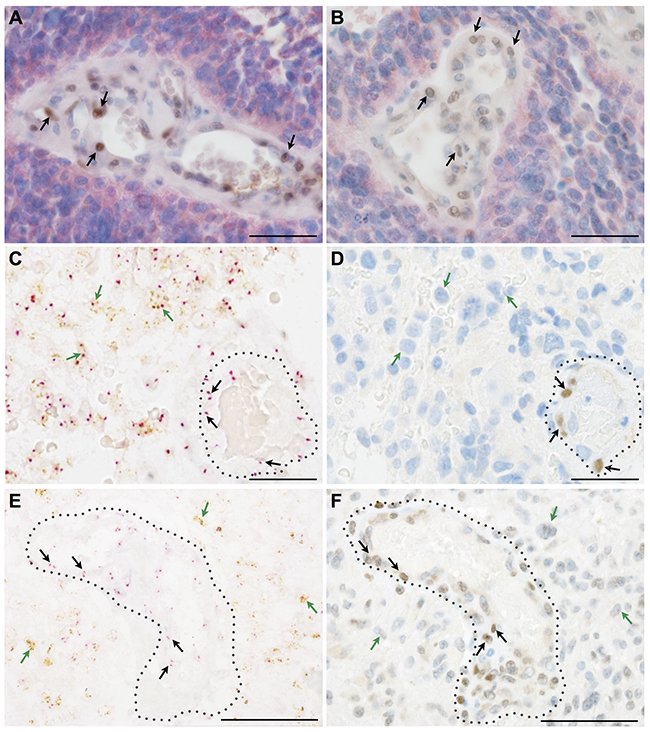 Figure 3: Key EMT molecules are expressed by non-neoplastic vessel-associated cells in human astrocytomas. (A, B) Double immunohistochemistry for mutated IDH-1 (R132H) (red) as a marker for neoplastic glial cells in a secondary glioblastoma together with (A) SLUG (brown, arrows) or (B) TWIST (brown, arrows) indicating that EMT molecules are restricted to IDH-1 (R132H)-negative, vessel-associated cells. (C, E) Silver in-situ hybridization (SISH) staining (brown dots; green arrows) for EGFR-amplification indicating glial cells in primary glioblastoma and chromosome 7 control probes (red dots; red arrows) combined with (D) SLUG and (F) TWIST immunohistochemistry showing that mutated glioma cells are negative for EMT molecules, the latter being present on tumor-associated blood vessels (dotted lines; scale bars: A-F 50μm).