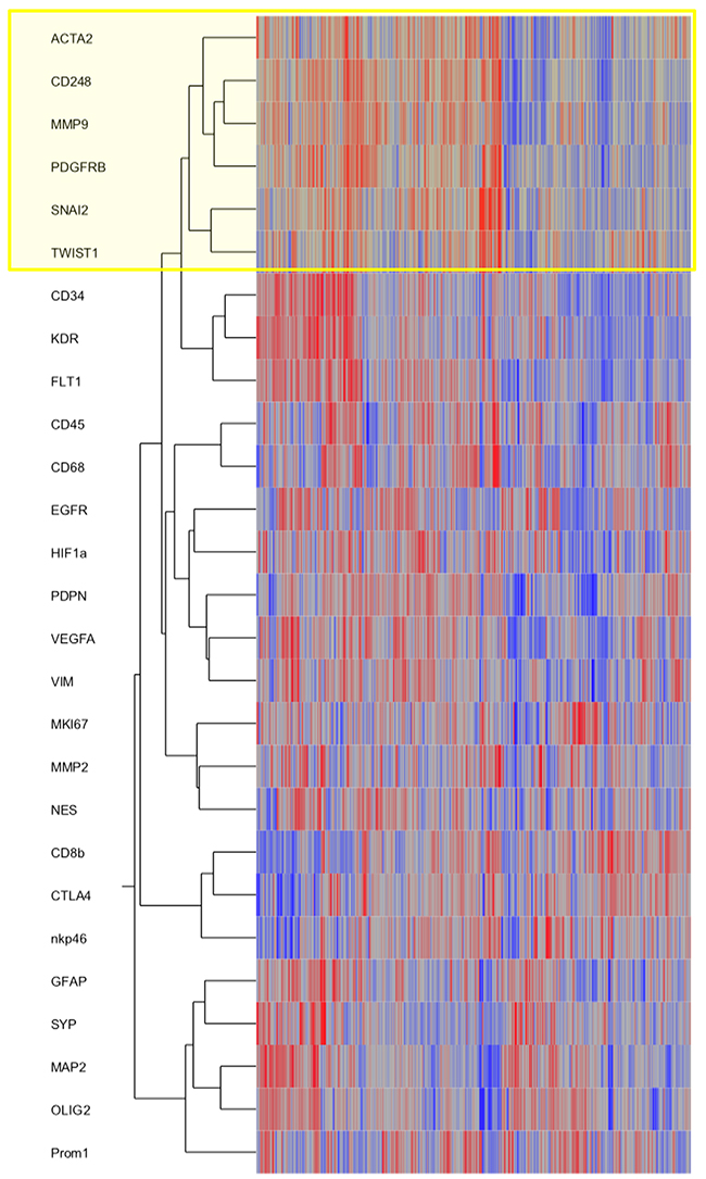 To strengthen our in vivo findings, we assessed the TCGA database (Figure 5). We included key genes involved in the EMT process such as SNAI2 (gene encoding SLUG protein) and TWIST in a cluster analysis together with selected markers for pericytes/VAMCs, endothelial and immune cells as well as resident or neoplastic neuroectodermal cells. Furthermore, central factors of hypoxia, angiogenesis or cell migration/invastion were included. The hierarchical clustering revealed that EMT genes (SNAI2, TWIST) cluster with pericytic/VAMC markers (ACTA2, CD248, PDGFRβ indicating a strong correlation and spatial association of EMT factors and pericytic/VAMC genes (Figure 5 and Supplementary Figure 4).