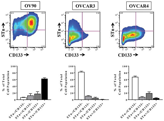 Figure 1: STn and CD133 are co-expressed in human ovarian cancer cell lines. A representative example of flow cytometric scatter plots for STn and CD133 levels in OV90, OVCAR3 and OVCAR4 cells is shown along with quantification of the four populations analyzed (STn-/CD133-, STn-/CD133+, STn+/CD133- and STn+/CD133+). Error bars represent the mean ± SEM of three independent experiments.