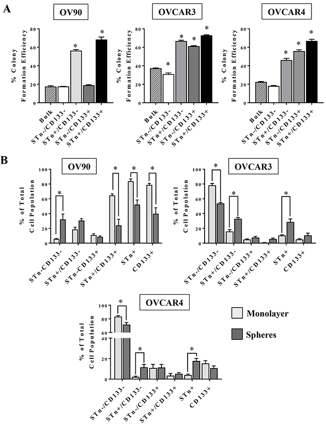 Figure 2: STn+ and CD133+ cells have enhanced colony formation capacity and are enriched in spheres. (A) The indicated sub-populations of OV90, OVCAR3 or OVCAR4 cells were isolated by FACS and seeded in soft agar. Unsorted OV90, OVCAR3 or OVCAR4 cells were seeded in parallel as a control. After 21 days, colonies ≥20 cells were counted and the percent colony formation efficiency of each population was calculated as described in Material and Methods and compared to that of unsorted cells. (B) OV90, OVCAR3 and OVCAR4 cells were cultured under either monolayer or sphere conditions for 10-12 days. At the end of this incubation period, the relative frequency of each sub-population was determined by flow cytometry. Error bars represent the mean ± SEM of a minimum of three independent experiments *p < 0.05.